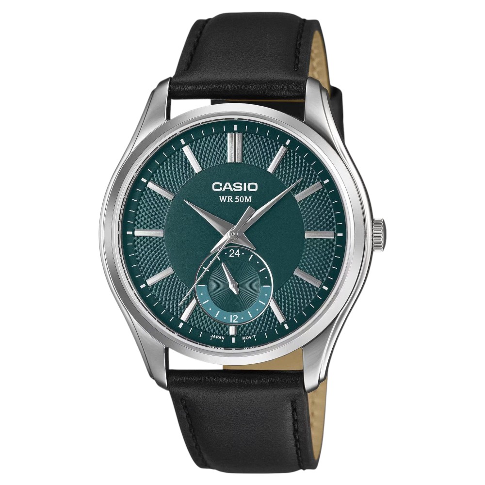 CASIO MTP-B315L-3AV là mẫu đồng hồ nam mang phong cách tối giản hiện đại, nổi bật với mặt số xanh (blue-green) trẻ trung kết hợp dây da đen thanh lịch. Thiết kế này giúp sản phẩm dễ dàng phối với nhiều phong cách – từ đi học, đi làm đến đi chơi.